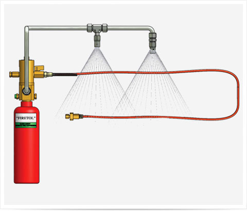 In the Indirect system, heat sensitive polymer tubing acts only as a detection device. In this method at the time of fire the heat sensitive polymer tubing attached to the FIRETOL system detects the fire and operates the FIRETOL system valve and the extinguishant is delivered through steel pipes and the entire area is flooded through nozzles attached to the pipes.